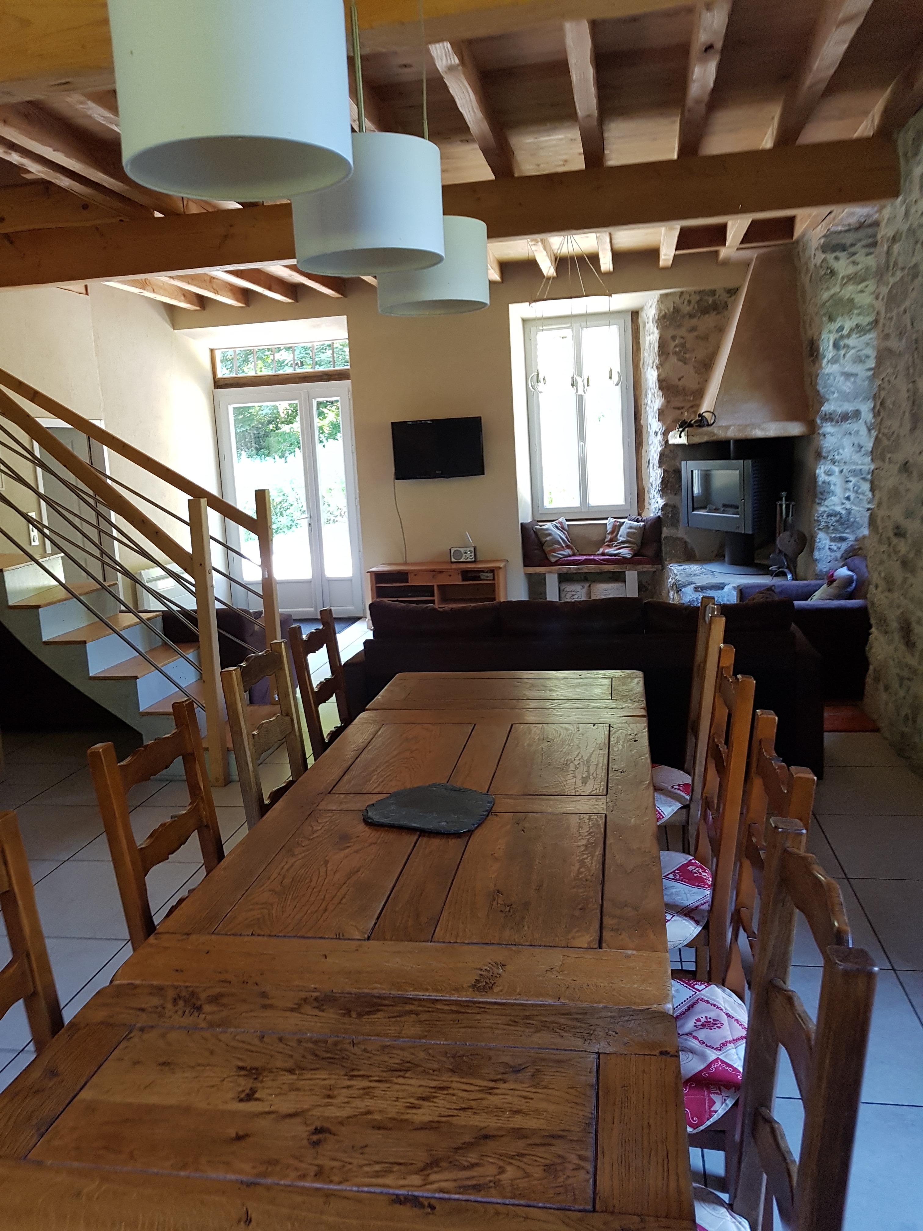 - une grande pièce à vivre avec salon, cheminée équipée d’un poêle à bois, TV écran plat, lecteur DVD, radio, salle à manger/cuisine entièrement équipée avec lave vaisselle, four, micro-ondes, grille-pain, bouilloire, cafetière Senseo et à filtre…